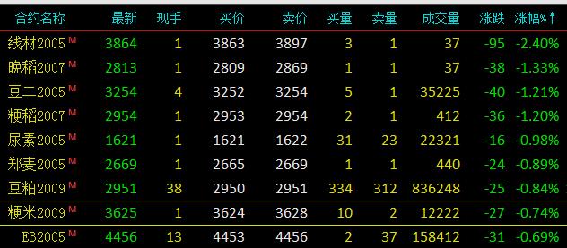 截至午间收盘,粳米主力2009合约下跌0.74%、粳稻2007合约下跌1.2%、晚稻2007合约下跌1.33%。