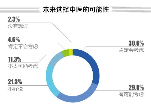 此次疫情,让中医的地位在民众心目中普遍提高。在问到未来是否会选择中医的时候,有30.6%的受访者表示肯定会考虑,29.8%的受访者表示有可能考虑。