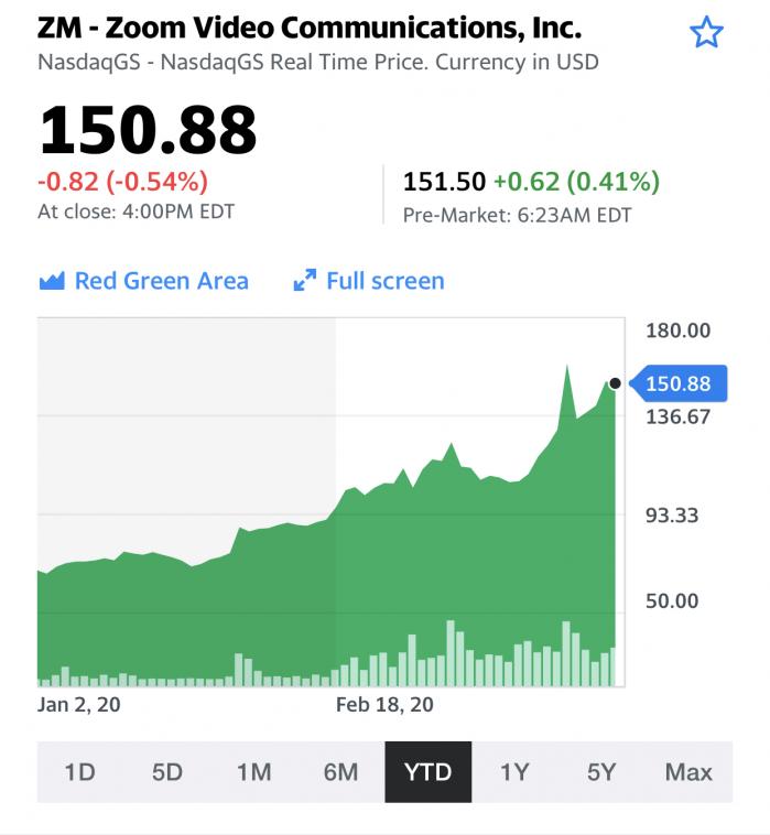 在新冠疫情爆发以来,Zoom在动荡的美股市场可谓一骑绝尘。截至目前,股价已上涨到了150美元,市值涨到420亿美元。