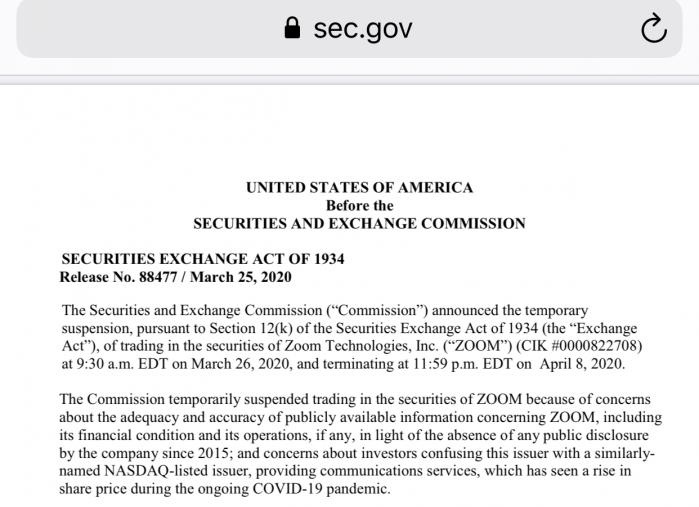 SEC在3月25日发布声明称,已暂停该股票的交易,直到4月8日起恢复。“委员会暂时叫停该股票交易的依据有两点,一是Zoom Technologies自2015年以来就从未披露过任何财务和运营的信息,二是委员会认为一部分的投资者可能搞错了股票,把Zoom Technologies误认为是那家纳斯达克上市的通讯服务公司,后者的股价自疫情爆发以来上涨不少。”SEC发布的文件指出。