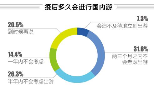 在疫情好转之际,《21世纪经济报道》、21俱乐部联合大正市场研究所开展了《疫后经济生活预期调查》(以下简称调查),问卷对旅游业、餐饮业消费行为预期进行了摸底。调查显示:73.8% 的受访者会在疫后3个月后选择外出就餐;31.6%的受访者疫后两三个月之内不会考虑出游,26.3%的受访者表示,疫后半年内不会考虑出游。
