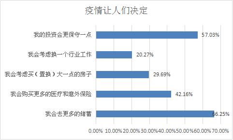 经历本次疫情,人们会普遍遏制自己的消费欲望,有66.3%的受访者表示会去更多的储蓄,有57.03%的受访者表示投资会更保守一点,有42.16%的受访者表示会购买更多的医疗和意外保险。
