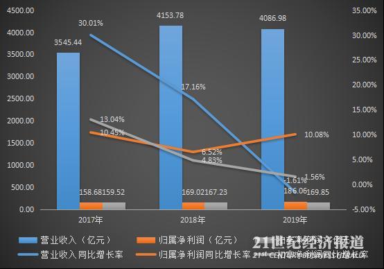 3月31日,工业富联(601138.SH)披露2019年年度报告,报告显示,公司实现营业收入4086.98亿元,同比增长-1.61%;实现归属净利润186.06亿元,同比增长10.08%;扣非净利润169.85亿元,同比增长1.56%。观看近三年工业富联的营收增长率走势,其营收增速连续两年下滑,2019年更是出现了负增长。