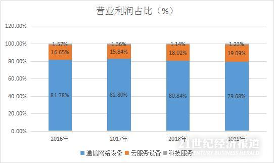 从营业利润占比来看,通信网络设备占比任然是主要的利润来源,但是在近几年占比有所降低,在2019年下降到80%以下。而云服务设备及科技服务业务表现与通信网络设备业务截然不同的趋势,在2019年,云服务设备及科技服务业务利润也有所提升,利润占比有所上升。