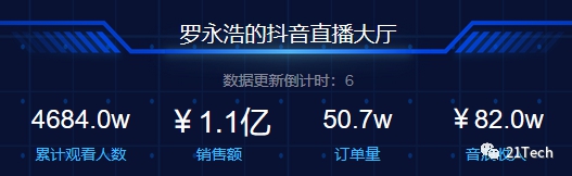 据抖抖侠数据,截至22:17,罗永浩的抖音直播大厅累计观看人数达4684万人,销售量额1.1亿元,订单量50.7万,音浪收入82万。(非官方数据,数据仅供参考)