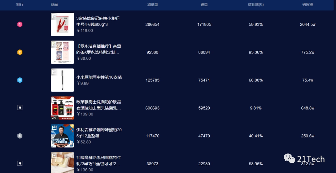 第一个带货商品为9.9元包邮10支小米巨能写中性笔,几乎上架瞬间秒空。而销量最高的是小龙虾,卖出超17万份,销售额超2000万元。