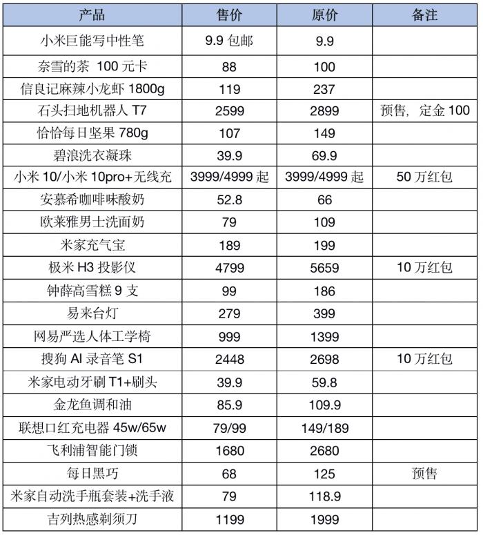 可以看出,罗永浩的这场直播,小米及其生态链企业成为最大广告主,总共有5款产品出现。当天,小米中国区总裁卢伟冰也来到直播间,和罗永浩尬聊了几句,二人之前在手机圈没少打口水仗,现在却变成了甲方乙方。