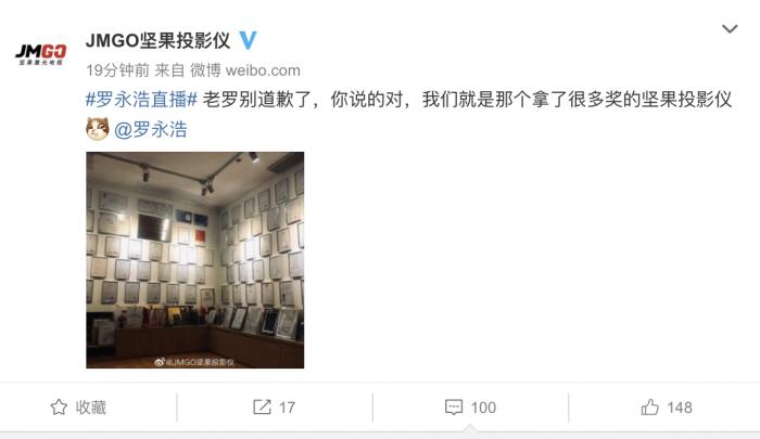 但话已出口,坚果投影仪的官方微博也是趁热打铁,通过官微喊话罗永浩“别道歉了,你说的对”,这让罗永浩更为尴尬。