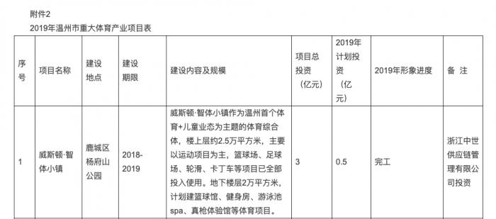 此外,温州市体育局官网显示,浙江中世供应链管理有限公司2019年计划0.5亿元投资温州首个体育+儿童业态为主题的体育综合体——威斯顿·智体小镇,楼上层约2.5万平方米,地下楼层2万平方米,2019年工程形象进度是“完工”。