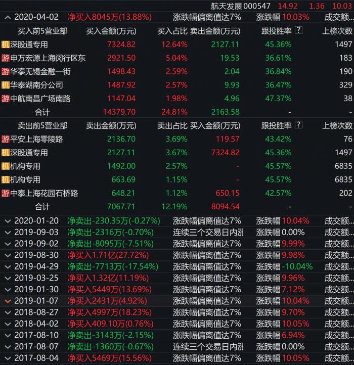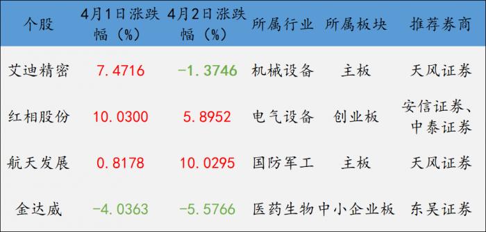 4月2日上榜的则有:1)航天发展,由天风证券独家推荐;2)金达威,由东吴证券独家推荐。