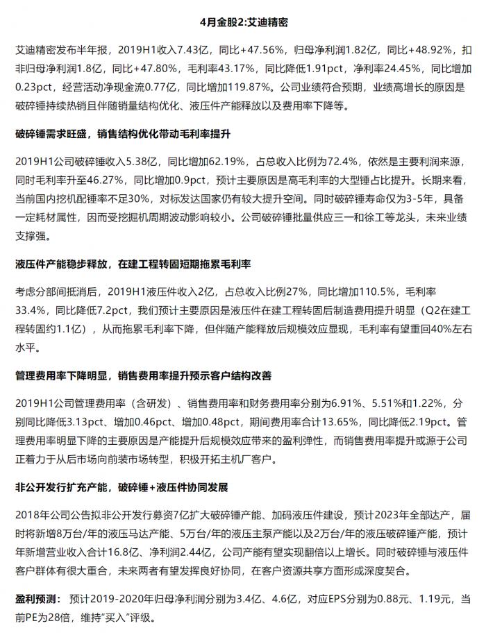 尽管推荐的是4月金股,但天风证券推荐该股时候使用的逻辑引用自2019年8月8日的研报《艾迪精密(603638):半年报符合预期,破碎锤结构优化,液压件产能稳步释放》。而在该份研报中,天风证券主要是对上市公司2019年半年报披露数据的分析。