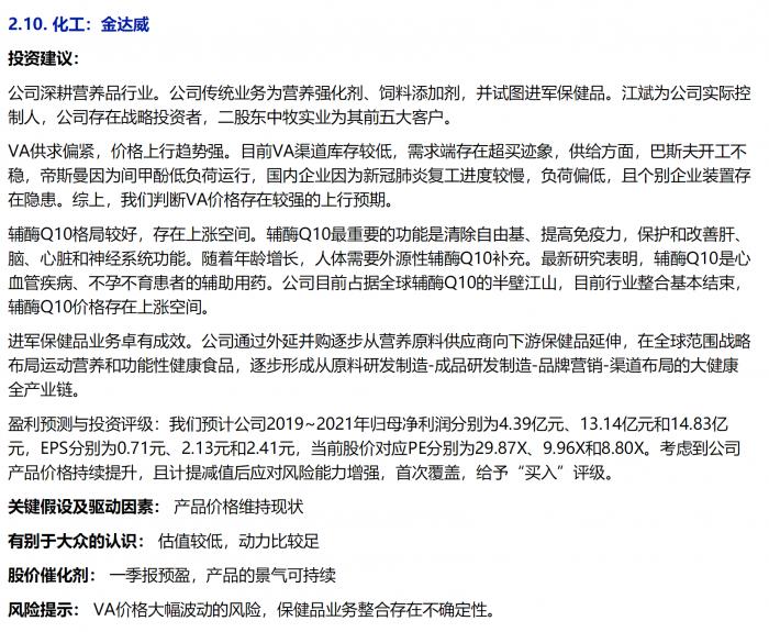 东吴证券荐股时称,上市公司经营拐点隐现、平台价值凸显。东吴证券荐股逻辑有三:1) VA供求偏紧,价格上行趋势强;2)辅酶Q10格局较好,存在上涨空间;3)公司进军保健品业务卓有成效。考虑到公司产品价格持续提升,且计提减值后应对风险能力增强,首次覆盖,予以“买入”评级。