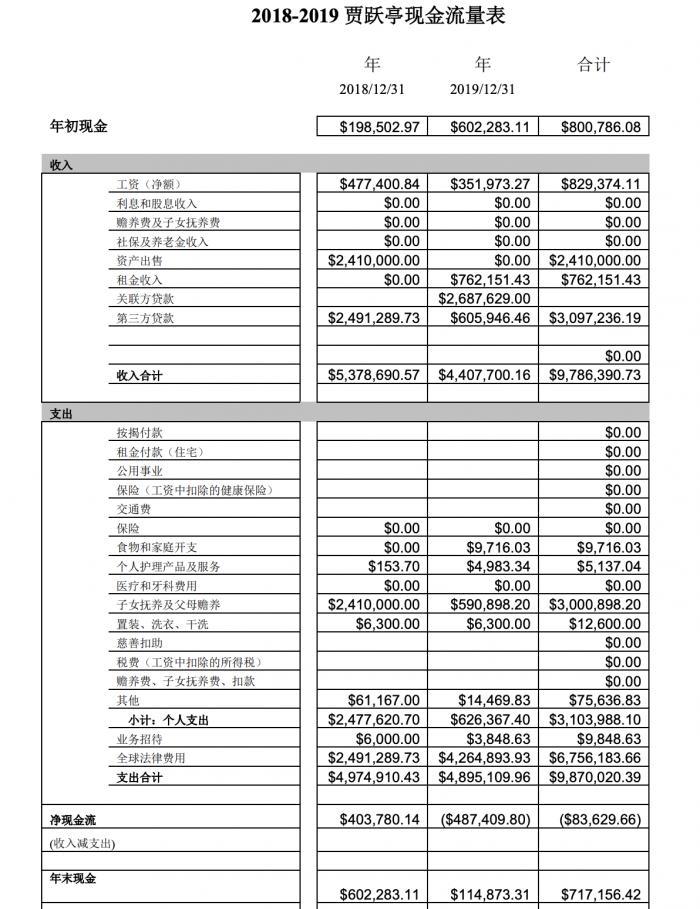 根据贾跃亭提交的2018-2019年现金流量表,其两年的收入合计978万美元,其中工资收入约83万美元,资产出售收入为241万美元,租金收入为76万美元,第三方贷款为309万美元。两年的总支出为987万美元,其中包括子女抚养及父母赡养费用300万美元,全球法律费用675万美元。