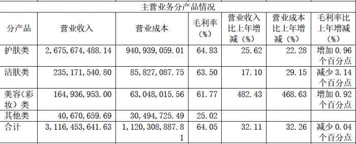 按品类来看,2019年,珀莱雅占比85.86%的护肤类产品营收26.76亿元,同比增长25.62%;占比7.55%的洁肤类产品营收2.35亿元,同比增长17.1%;占比5.29%的美容(彩妆)类产品营收1.65亿元,同比增长482.43%;其它类产品占比1.3%,营收0.41亿元。