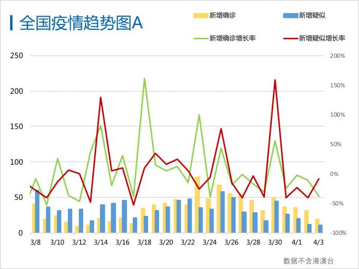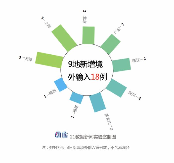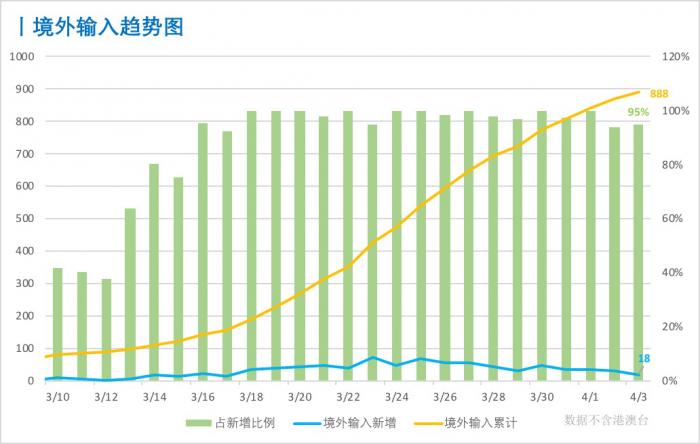 另一方面,4月3日,全国新增18例境外输入病例,较前一日减少11例,增速有所放缓。截至4月3日24时,累计报告境外输入确诊病例888例。境外输入病例连续19天占新增病例的90%以上;近19天,全国累计新增确诊病例779例,其中765例为境外输入,占比达98.20%。
