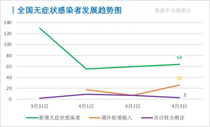 4月3日,全国新增新增无症状感染者64例,其中境外输入无症状感染者26例;当日转为确诊病例3例(境外输入转为确诊2例);当日解除医学观察58例(境外输入解除医学观察6例)。尚在医学观察无症状感染者1030例(境外输入239例)。