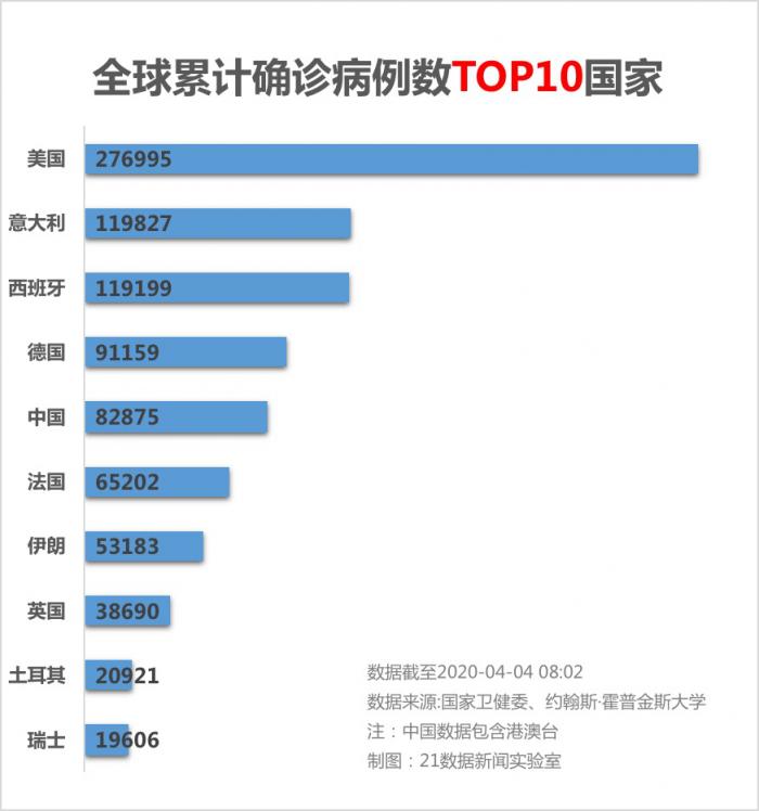 美国约翰斯·霍普金斯大学发布的实时统计数据显示,截至北京时间4月4日06时30分左右,全球新冠肺炎确诊病例累计1094068例,累计死亡 58773例,累计治愈225519例。