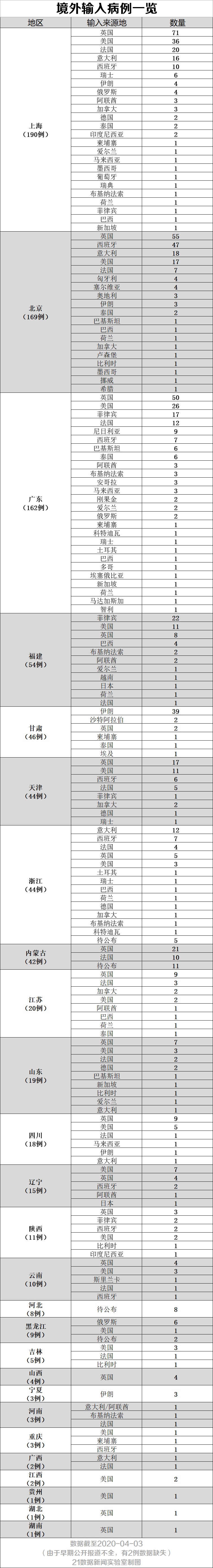 英国、美国、西班牙等疫情严重地区,是境外输入主要来源地。截至4月3日24时,英国已累计输入病例271例,美国输入134例,西班牙输入83例。(详情查看文末附表:境外输入病例一览)
