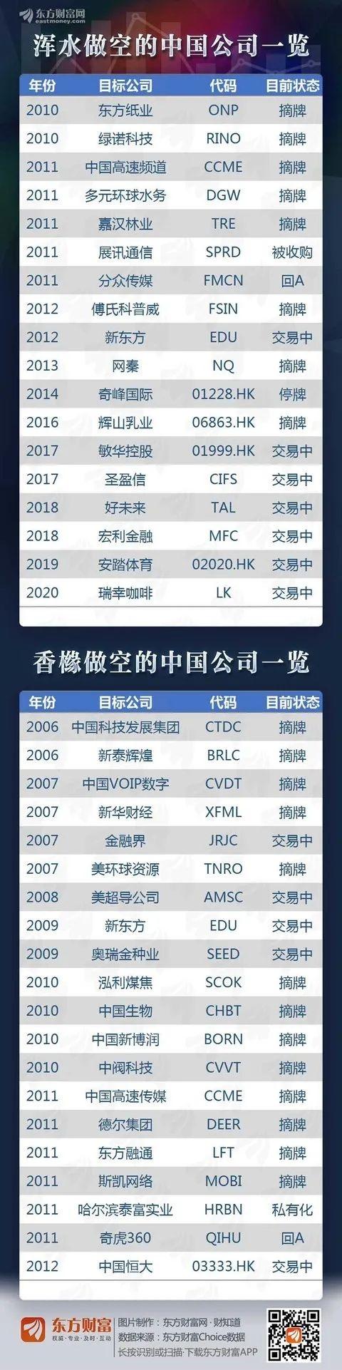 除了浑水,香橼也是一家经常瞄准中国公司的做空机构,2006年以来曾做空过新华财经、新东方、中国生物、东方融通、奇虎360、中国恒大等20家公司,这20家公司中目前处于正常交易状态的只有5家,其余多数已摘牌(包括私有化或回归A股)。
