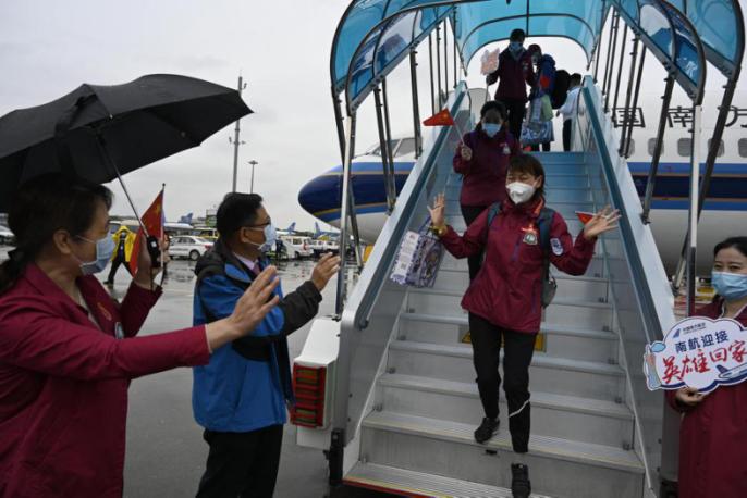4月5日中午,广东援助湖北武汉医疗队又有135名队员圆满完成援助任务,返回广东,包括中山大学孙逸仙纪念医院医疗队131人、广东援助湖北武汉医疗队指挥部1人以及广东省中医院副院长张忠德团队3人,共135人。