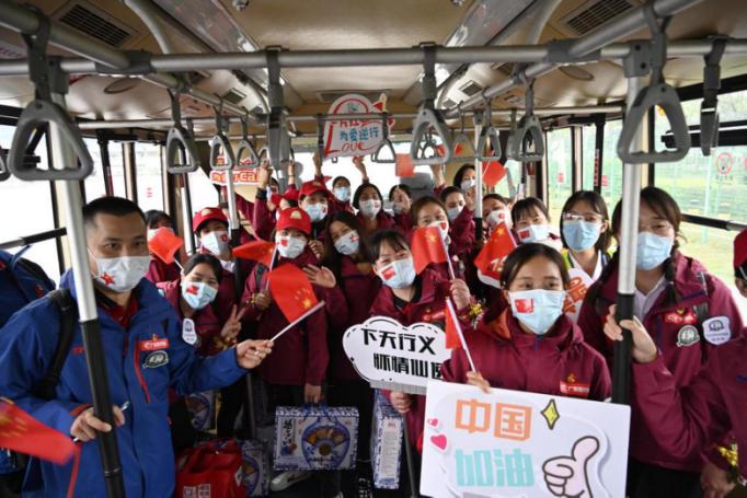 医疗队员在机场摆渡车上合影