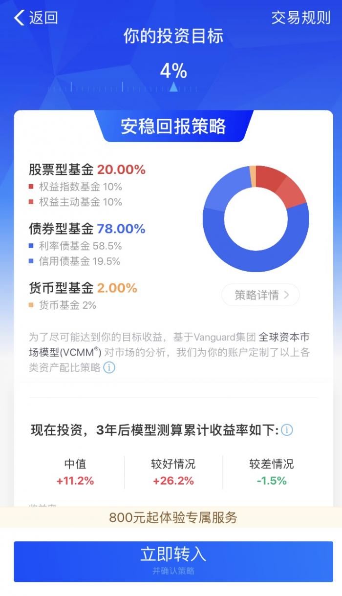 4月2日,蚂蚁金服和全球最大公募基金公司Vanguard集团独家合作的基金投资顾问服务“帮你投”上线支付宝。相比国外投顾服务的高门槛,“帮你投”将投资门槛降低到了800元人民币。这个门槛可谓是很友好了。