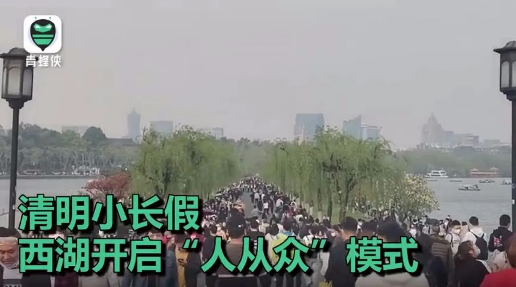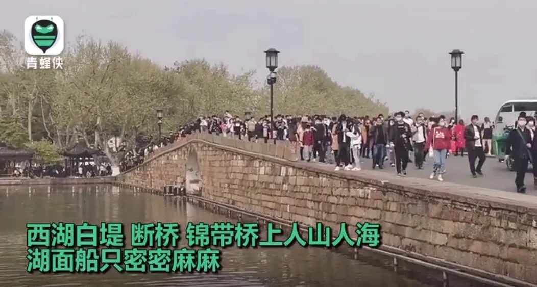 ↓↓西湖白堤、断桥、锦带桥……到处都是游客湖面上船只密密麻麻