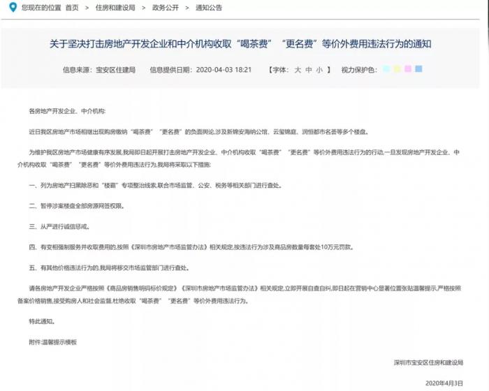 据通知显示,为维护宝安区房地产市场健康有序发展,4月3日起开展打击房地产开发企业、中介机构收取“喝茶费”“更名费”等价外费用违法行为的行动。