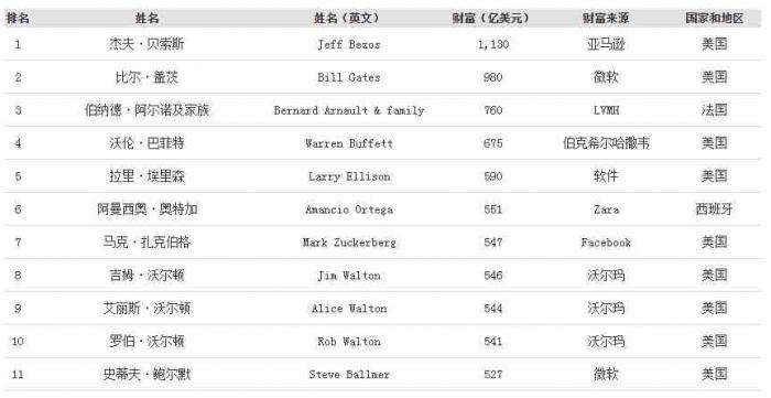 亚马逊首席执行官、身家过千亿美元的杰夫·贝索斯(Jeff Bezos)虽然财富值下降180亿美元,但是依旧连续第3年位列榜首。贝索斯今年榜单上的身家为1,130亿美元,少于去年的1,310亿美元。贝索斯的身家之所以下降,主要是因为不久前的离婚。比尔·盖茨依旧为第2位,财富980亿美元,比去年增长了15亿美元。LVMH的伯纳德·阿尔诺排名有所上升,并首次进入前3名,名列第3位。此前,沃伦·巴菲特(Warren Buffett)的财富下降了150亿美元。巴菲特名列第4位,财富675亿美元,少于去年的825亿美元。甲骨文公司创始人、董事长、首席技术官拉里·埃里森(Larry Ellison)排名第5位。埃里森虽然排名上升,但是今年财富下降了35亿美元,降至590亿美元。