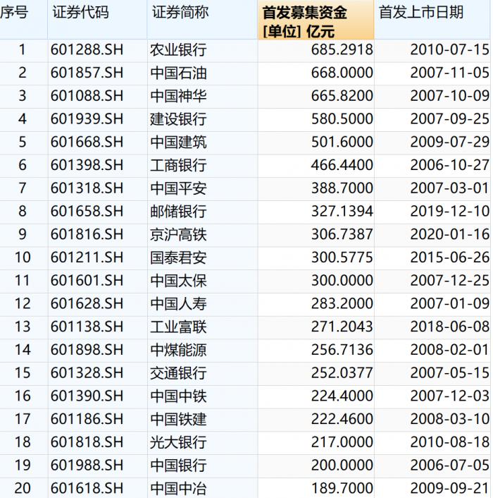 A股IPO募资金额前20位 图片来源:Wind