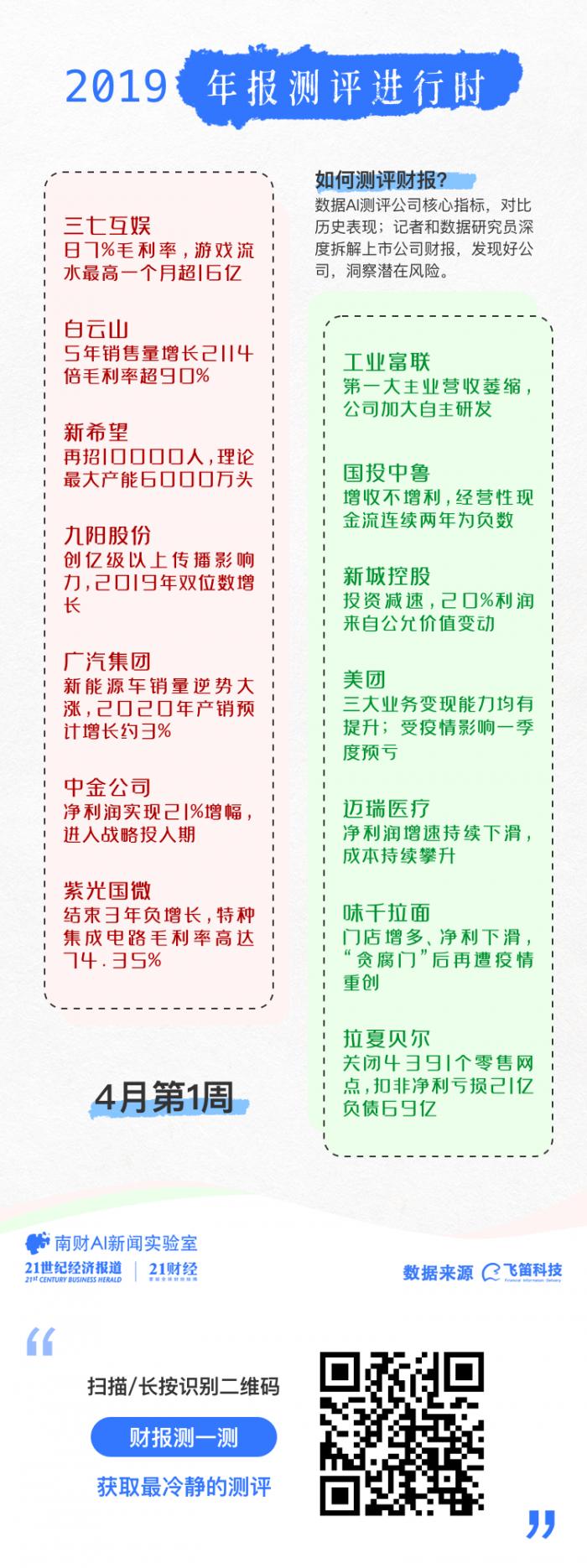 从全市场来看,截至4月7日,共有796家A股上市公司发布2019年年度财报,上周(3月30日-4月5日)新增291家公司发布年度财报,4月6日-4月7日截至发稿已有11家公司发布年报。南财AI新闻实验室从财报季开始以来对所有已发布的上市公司财报进行评测,并对部分关注度高的公司财报深入拆解。