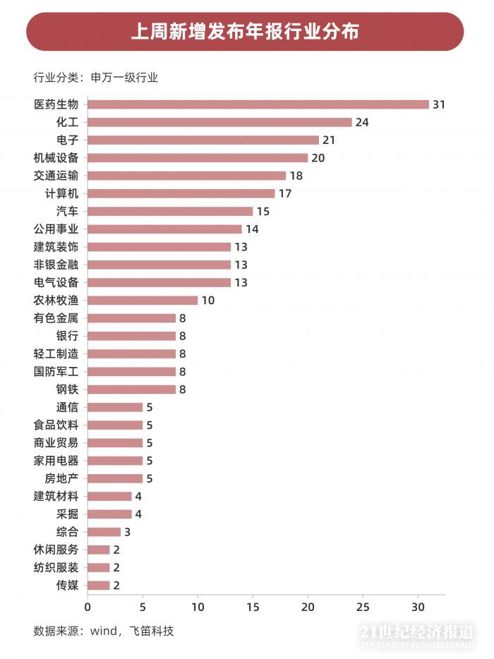 行业分布方面,上周新增发布2019年年度财报的上市公司中,医药生物行业年报发布数最多,达31家,化工电子行业其次,分别为24家和21家,休闲服务、纺织服装、传媒行业最少,均仅为2家。