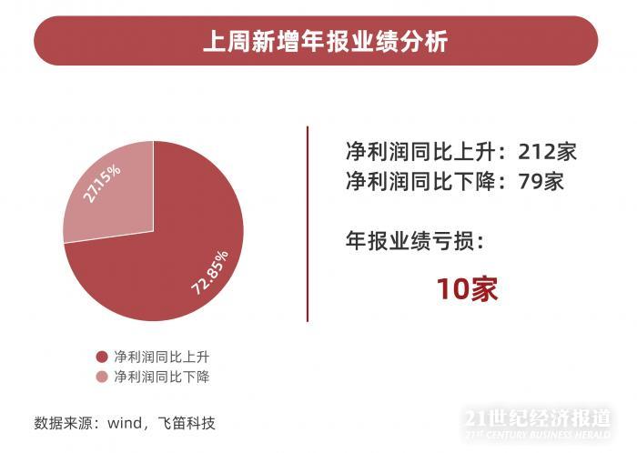 从上周新增年报披露的业绩整体情况来看,截至4月5日,已发布2019年度财报的291家上市公司中,共有212家企业净利润同比上升,79家净利润同比下降,业绩上升企业占比达72.85%,相比前一周64.16%有所上升。