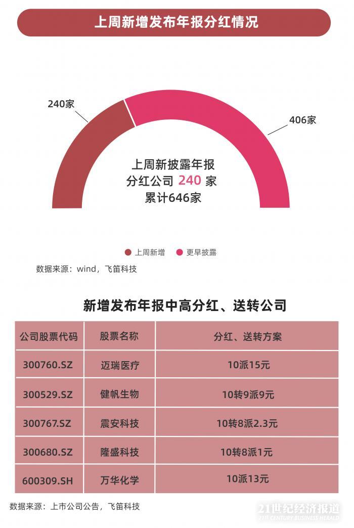 从已披露的年报分红情况来看,截至4月5日,上周发布年报的291家上市公司中,有240家公司年报披露将进行分红或转增,占比超过80%,全市场已披露年报分红、转增的上市公司累计数量达到646家。