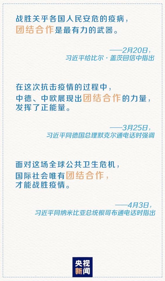 习近平在与各国领导人交流时给出了战胜疫情的“中国倡议”——让合作的阳光驱散疫情的阴霾。