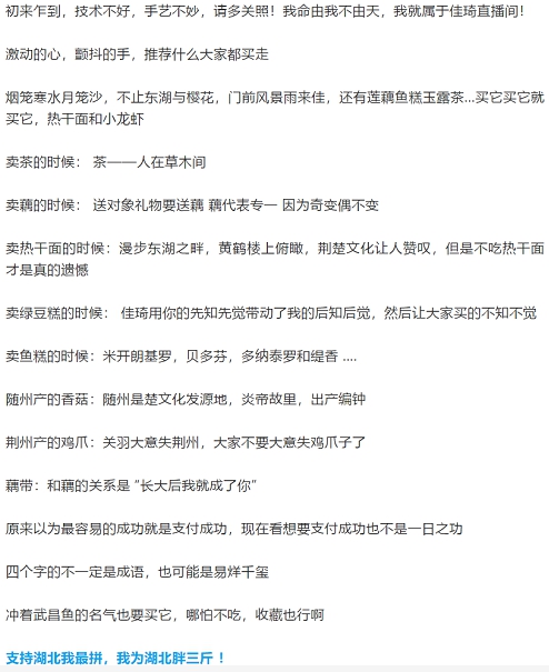 紧接着一段“八连押”把湖北农产品夸得纷纷“秒光”:烟笼寒水月笼沙,不止东湖与樱花。门前风景雨来佳,还有莲藕鱼糕玉露茶,凤爪藕带热干面,米酒香菇小龙虾,赶紧下单买回家,买它买它就买它,热干面和小龙虾!