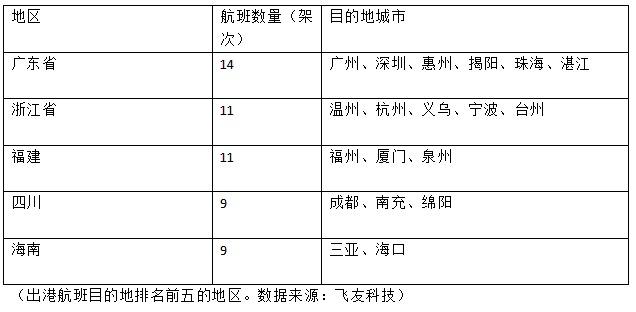 通过数据观察,131个航班去往了全国包括湖北本省在内的25个地区。尽管若以去往城市算,成都为当日最热门的目的地,但若以省(自治区、直辖市)为统计范围,则排名第一的为广东省,当日共有14架航班的目的地为该省的广州、深圳、惠州、揭阳、珠海、湛江等市;福建省和浙江省同为11架次,四川和海南同为9架次,山东、上海、辽宁则为5架次。