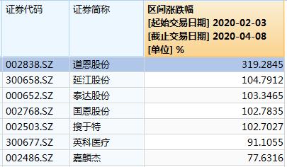 二级市场的突出表现,使得道恩股份成为了口罩股中的最大赢家,2月3日至今累计涨幅达到319.28%,排名第二的延江股份涨幅则为104.9%。