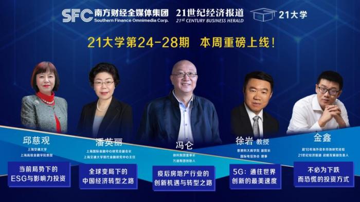 与此同时,在全球疫情蔓延的背景下,给人们带来了诸多的困惑。比如,在此恶劣情况下,投资者悲观情绪不断蔓延,如何进行今后的投资?企业如何面临社会责任的大考,ESG与影响力投资当下蕴含哪些机会,又有哪些潜在的系统风险?5G技术又将会如何发展,迎来生命的春天?中国经济将迎来哪些转型?怎样才能赶上新一趟世界经济列车?疫情下的房地产行业如何做好转型升级?如何顺利活下去?本周,21大学重磅邀请著名企业家冯仑、经济学家潘英丽、香港科技大学徐岩教授、上海交大邱慈观教授、21世纪经济报道战略发展部负责人金鑫5位嘉宾做客直播间,与读者共聚一堂,深挖疫情中投资,经济,地产,企业责任,技术发展那些事。