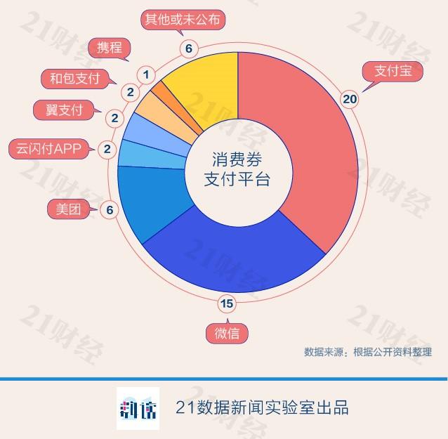 而从支付平台看,各地消费券以电子形式为主,需要通过微信、支付宝或其他APP申领和使用。根据统计,消费券代发基本由支付宝和微信平分天下。和支付宝相比,微信的发放方式更多样,比如可通过微信钱包、卡包、公众号、小程序等入口发放。值得注意的是,到了后期,选择支付宝平台的城市越来越多,嘉兴第一轮选择了微信,第二轮更改为了支付宝。