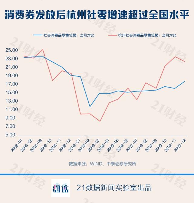 事实上,我国发放消费券并非首次。2009年,为应对国际金融危机,杭州市发放了9.1亿元的消费券。调研显示,消费券在杭州的拉动效应达到1∶1.3,是直接发放现金的2倍。杭州社零增速出现了非常迅速的回升,增速超过全国水平。