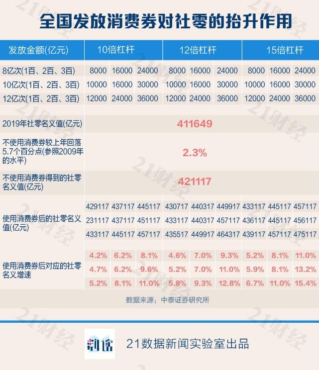 中泰证券测算了全国范围投放消费券对社零的拉动作用。比照2008-2009年的社零回落比例 ,中泰证券测算不使用消费券的情况下,2020年全国社零同比增速约为2.3%。而假设全国投放消费券额度为800-3600亿元,按照10-15倍杠杆区间进行估算,对应的全年社零同比增速为4.2%-15.4%。