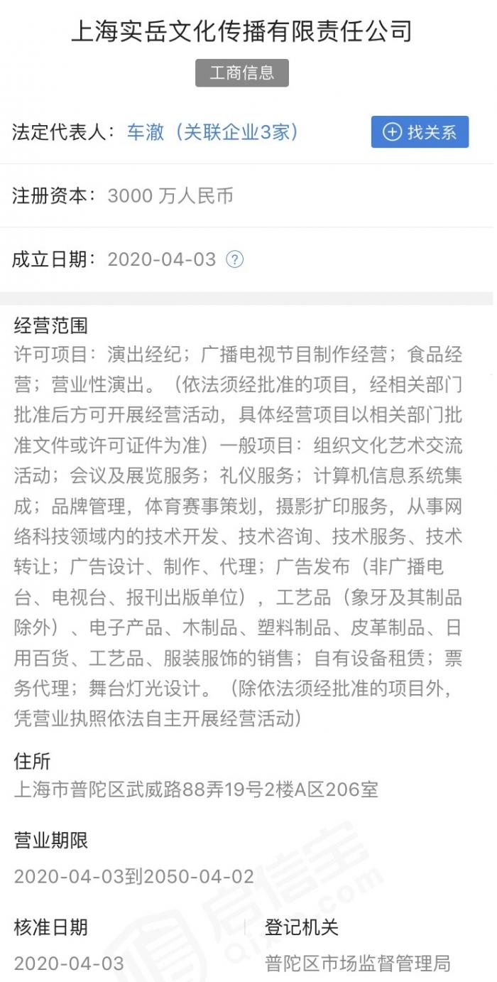 启信宝数据显示,4月3日,北京爱奇艺科技有限公司新增对外投资,成立上海实岳文化传播有限责任公司,法定代表人是爱奇艺副总裁车澈,注册资本3000万人民币,经营范围为演出经纪;广播电视节目制作经营;食品经营;营业性演出;品牌管理,体育赛事策划等。
