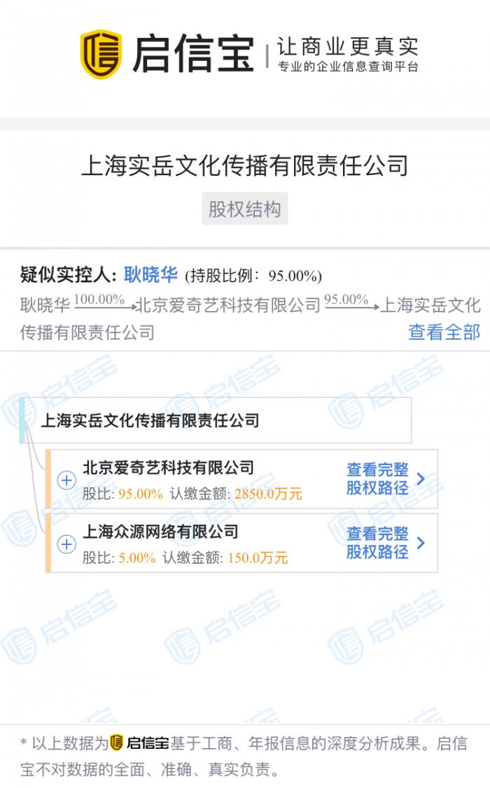 启信宝股东信息显示,北京爱奇艺科技有限公司持股95%,为该公司最大股东;爱奇艺创始人龚宇全资持股的上海众源网络有限公司持股5%,为公司第二大股东。