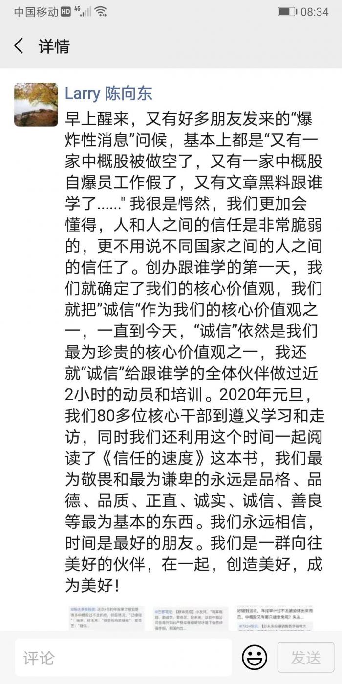 “跟谁学在这家公司没有持有任何股份,跟谁学为了支持它活下去,不但没有跟它收钱,还给了300万启动资金。”陈向东说。