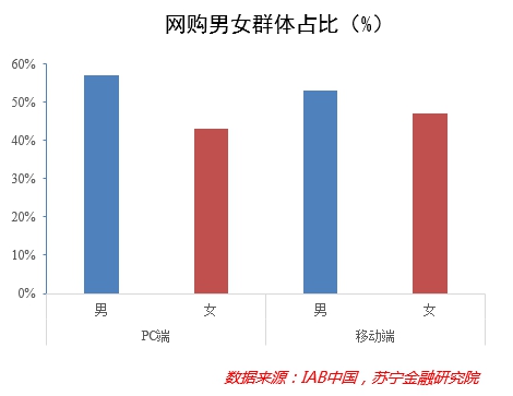 如果说商场是女性消费者的主战场,那么线上就是男性消费者的阵地。根据波士顿咨询发布的研究报告,中国男性消费的种类和额度都在增加,而在线上消费方面,男性每年的平均开支超越了女性。美国互动广告局(IAB)与IAB中国联合发布的调查结果表明,无论是采取PC端还是移动端进行网购的中国居民,男性消费者占比均超过女性,其中PC端网购的男女占比分别为57%和43%,移动端网购则为53%和47%。有人戏称说“这些都是帮老婆买的”,但西南证券报告表明,男性在电器、服饰等领域表现出强劲的购买力。