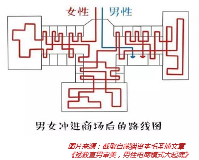 “男人来自火星,女人来自金星”,男女思维迥异,注定了他们消费方式的不同。与女性相比,男性消费者决策耗费时间更短、耐性更低,他们不会把时间花费在筛选比较上,其目的更明确,如果不能快速找到需要的商品,他们宁愿放弃购买,这可以从“男女冲进商场后的路线图”中窥见一斑。