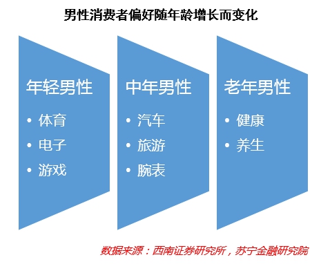 相比之下,男性消费者的偏好随着年龄的增长而表现出趋势性的差异:年轻男性的主要消费支出集中于体育、电子、游戏,中年男性偏好会更多地向汽车、旅游、腕表等高端消费以及奢侈品领域转移,老年男性则侧重于个人保健与养生消费。