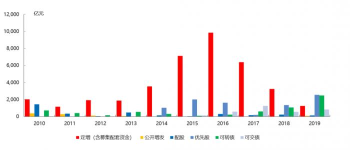 从2010-2019近十年上市公司再融资的几种方式来看,定向增发起到了为上市公司“输血”的重要作用。定向增发,俗称“定增”,一般是指上市公司向符合条件的少数特定投资者非公开发行股票的行为,上市公司通过定向增发募集的资金可以用做项目融资、对外收购、整体上市、大股东资产注入、重组、引入战略投资者、补充流动资金等多种用途,其中项目融资、对外收购占了定向增发用途的大多数。