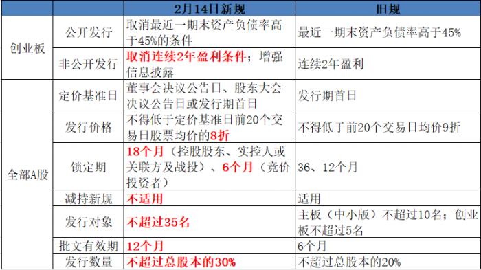 2018 年下半年以来,为缓解企业融资困难、提高直接融资占比,重点支持战略新兴产业发展,再融资政策迎来边际松绑。其中最重要的是今年2月14日,证监会发布了修改《上市公司证券发行管理办法》、《创业板上市公司证券发行管理暂行办法》、《上市公司非公开发行股票实施细则》的正式稿,定向增发正式迎来松绑。与旧的政策对比,此次再融资新政出现了大幅放松,如下: